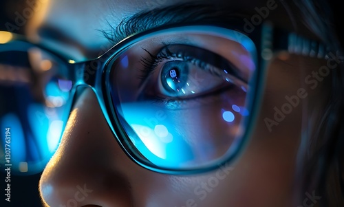 A close-up of the reflection in someone's glasses, showing an eye with blue light from digital screens and computer displays on it