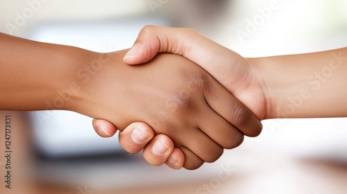 A close-up of two hands shaking during a successful business meeting, with blurred documents and laptops on the table in the background