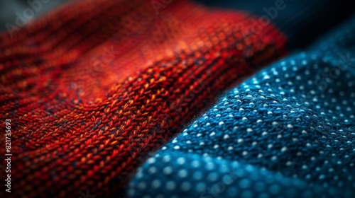A close-up of two socks, one red and one blue, laid out neatly together, showing a matching pair.