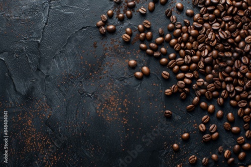 A close-up overhead view of roasted coffee beans scattered across a dark surface. The dynamic lighting creates dramatic shadows