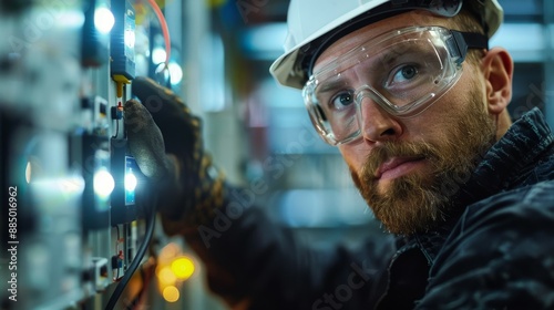 A close-up photo An electrician wearing safety goggles and gloves works on an electrical panel emphasizing the importance of safety gear while working with electricity