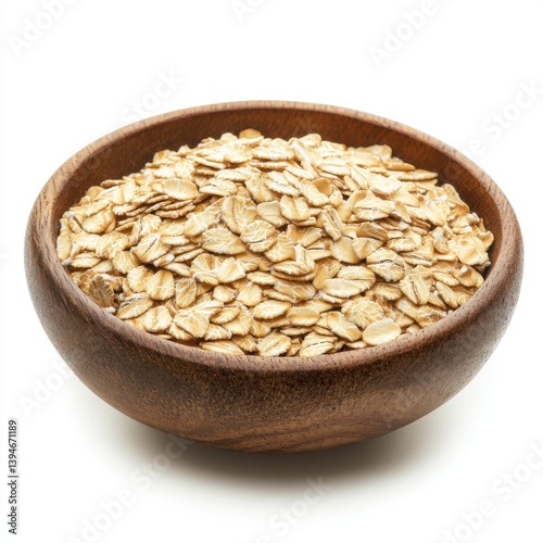 A close-up photo of a heap of oats in a wooden bowl, on a white background
