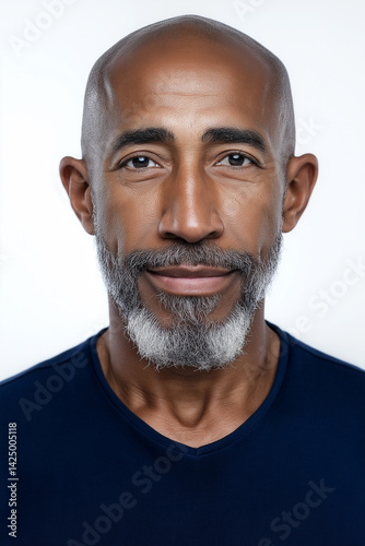 A Close-Up Portrait: The Serene Gaze of a Man in His Early 60s, Featuring a Distinguished Gray Goatee and a Calm Expression, Wearing a Deep Blue Crew Neck Shirt Against a Pure White Background.