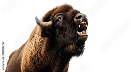 A close-up portrait of a brown bull with horns and shaggy fur, a powerful mammal of the wild
