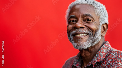 A close-up portrait of a handsome elderly African American man in formal wear against a red background with copy space. Suitable for business, fashion, or lifestyle concepts.