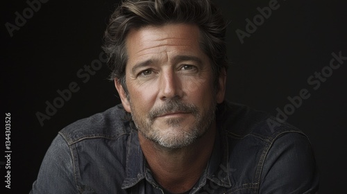 A close-up portrait of a man with a rugged appearance, featuring a subtle smile and tousled hair, set against a dark background.