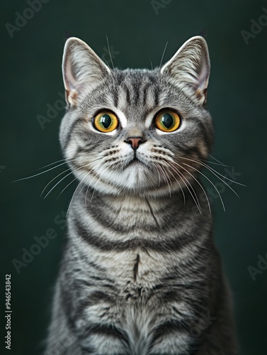 A close-up portrait of a surprised-looking gray tabby cat with large yellow eyes.
