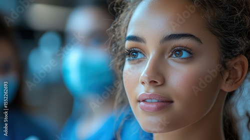 A close-up portrait of a thoughtful young medical student, her bright eyes filled with focus and ambition during a training simulation in a healthcare setting