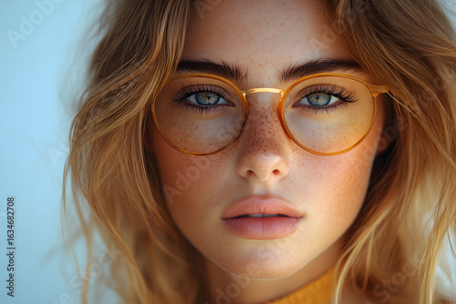 A close-up portrait of a woman with glasses and freckles against a soft blue background.