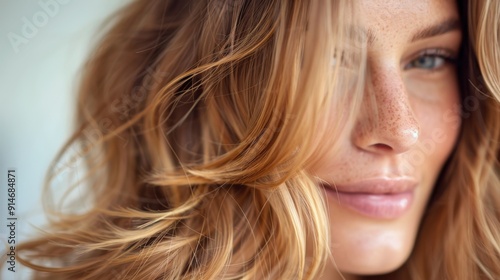 A close-up portrait of a woman with wavy blonde hair, smiling softly and looking serene, capturing the beauty of natural features and tranquility in a serene, well-lit setting.