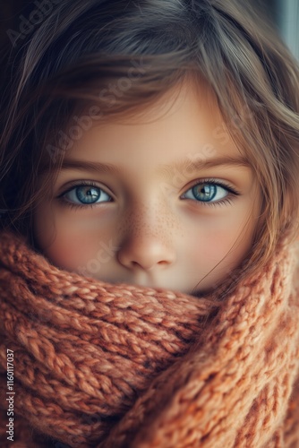 A close-up portrait of a young girl with striking blue eyes, wrapped in a cozy, oversized orange scarf. Her expression is soft and contemplative, with a hint of freckles on her cheeks.
