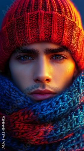 A close-up portrait of a young man wearing a vibrant red knitted hat and a blue patterned scarf, showcasing his striking features and intense gaze.