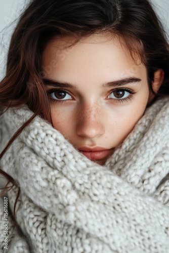 A close-up portrait of a young woman with long, wavy hair, wrapped in a thick, knitted scarf. She has a natural look with freckles and captivating brown eyes.