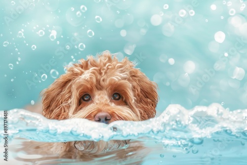 A close-up shot capturing the delightful expression of a poodle as it swims underwater, surrounded by bubbles. Beautiful simple AI generated image in 4K, unique.