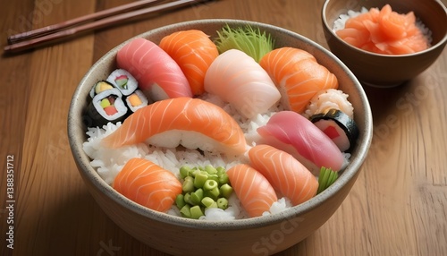 A close-up shot features a ceramic bowl filled with a vibrant assortment of sushi ingredients, set against a rustic wooden surface