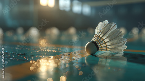 A close-up shot of a badminton shuttlecock lying on the court, illuminated by soft light. The shuttlecock's feathers are delicately arranged, casting shadows on the court's surface
