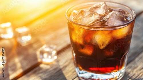 A close-up shot of a clear glass filled with iced coffee on a wooden table, with soft sunlight
