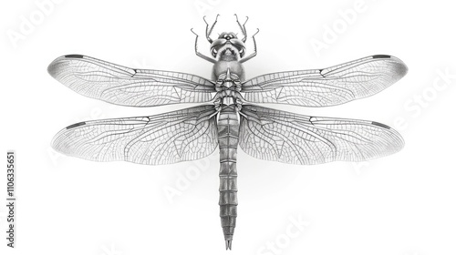 A close-up shot of a dragonfly perched on a white background, providing a clear view of its body and wings