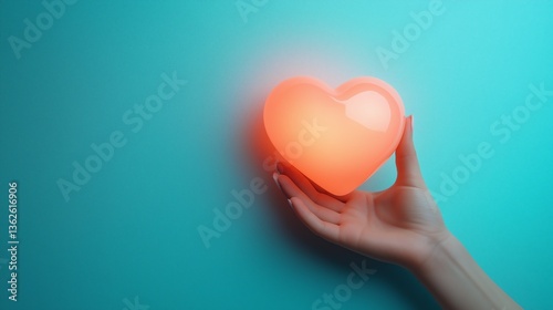 A close-up shot of a hand holding a glowing heart-shaped object against a turquoise background. The image conveys themes of love, care, and positive emotions for various contexts.