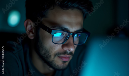 A close-up shot of a man wearing glasses, intently working on a computer at night. The scene is softly illuminated by the glow from the computer screen