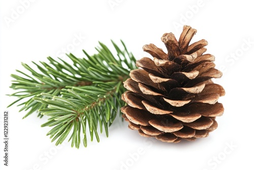A close-up shot of a pine cone sitting next to a pine tree branch