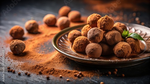 A close-up shot of a plate with chocolate truffles and cocoa powder scattered around it, creating a rich and decadent atmosphere , food on table, chocolate truffles