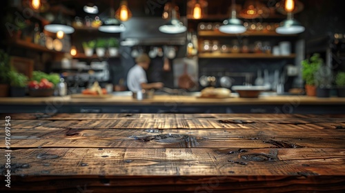 A close-up shot of a rustic wooden table top in a restaurant setting.