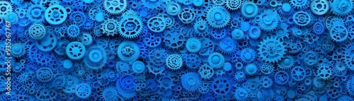 A close-up shot of a wall of blue cogs of different sizes. The cogs are arranged in a chaotic manner, but they all interlock seamlessly.