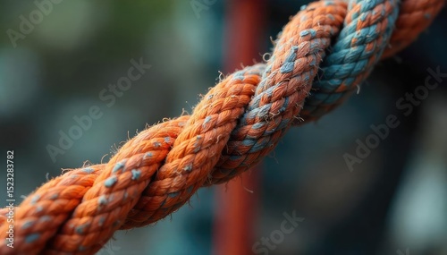 A close-up shot of a worn, frayed climbing rope, highlighting its texture and suggesting potential hazards and the risks involved in climbing , frayed, worn, reliability