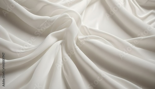 A close-up shot of rippling white fabric creates a sense of flowing, elegant texture.