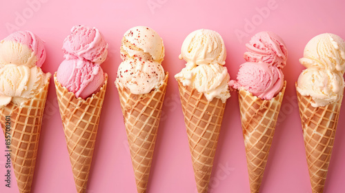 A close-up shot of six ice cream cones with pink and vanilla ice cream, arranged in a row on a pink background