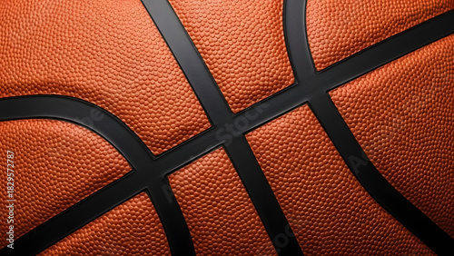 A close-up shot reveals the textured surface of an orange basketball, intersected by black lines creating dynamic patterns and shapes across the image, emphasizing texture and contrast, evoking a