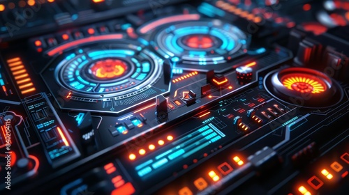 A closeup shot showcases a futuristic interface display, vividly illuminated with vibrant and dynamic colors