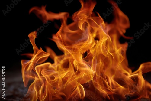 A closeup shot showcasing vibrant orange flames against a stark black backdrop emanating from a visible piece of wood
