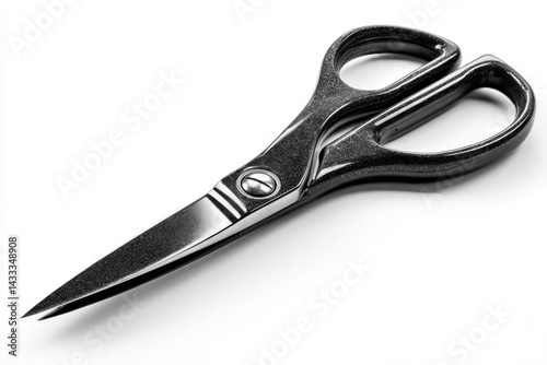 A close-up studio shot of professional black scissors with a shiny texture, set against a clean white background, showcasing its sharp blades and ergonomic design.