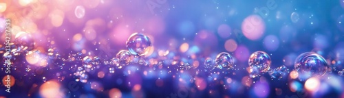 A close-up view captures a cluster of iridescent bubbles gently floating on a vibrant blue surface, reflecting light and creating a mesmerizing play of colors and textures.