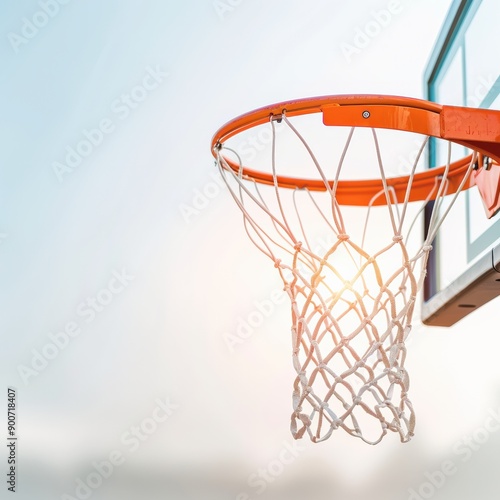 A close-up view of a basketball hoop with net against a bright sky, symbolizing sports, competition, and athleticism.