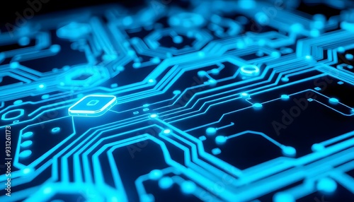 A close-up view of a blue-toned electronic circuit board with intricate patterns and traces