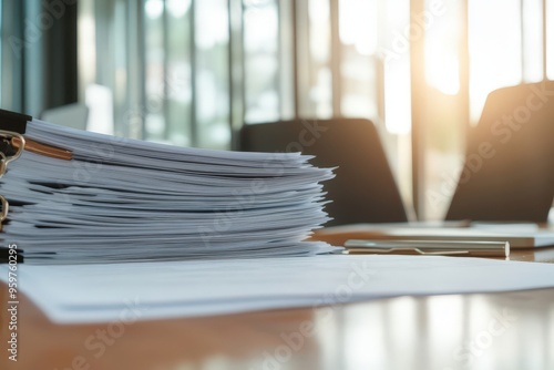 A Close-Up View of a Business Plan Document Stack and Notes Beside a Sunlit Office Setting