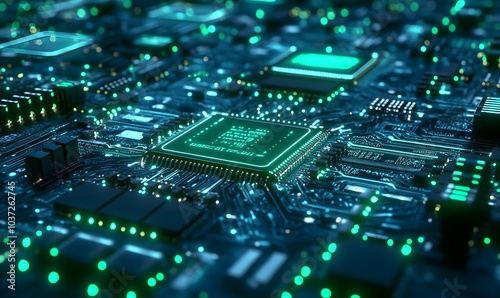 A close-up view of a circuit board featuring glowing green lights, intricate pathways, and microchips, illustrating modern technology and digital circuitry.