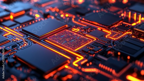 A close-up view of a circuit board with glowing orange connections, showcasing intricate electronic components and a modern technology aesthetic.