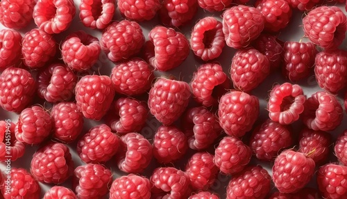 A close-up view of a collection of fresh, ripe raspberries, filling the frame with their vibrant red color and textured surfaces.