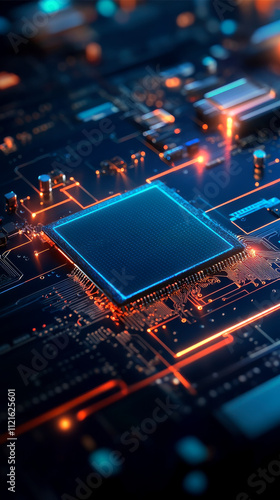 A close-up view of a computer circuit board with illuminated elements, showcasing intricate technology and modern digital design.