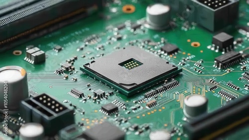 A close-up view of a computer motherboard showcasing a central processor and various electronic components on a green circuit board.