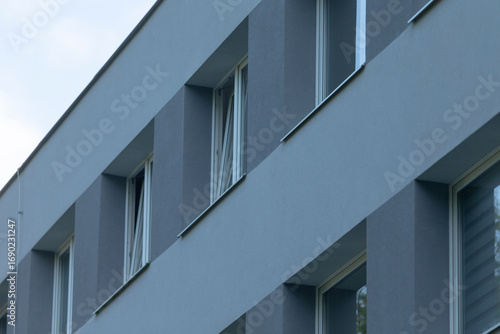 A close-up view of a contemporary building featuring a sleek grey exterior and aligned windows, showcasing modern architectural design elements.