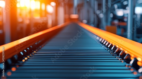 A close-up view of a conveyor belt in an industrial setting, illuminated by warm sunlight, showcasing a smooth pathway for transporting goods.