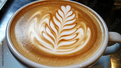 A Close-Up View of a Cup of Coffee with a Intricate Foamy Design