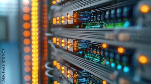 A close-up view of a data server rack, showcasing illuminated lights and intricate wiring, highlighting modern technology in data storage and processing.