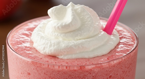 A close-up view of a delicious strawberry milkshake, topped with fluffy whipped cream and a pink straw.