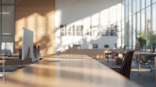 A Close-Up View of a Desk in a Modern Office with Sunlight Streaming In